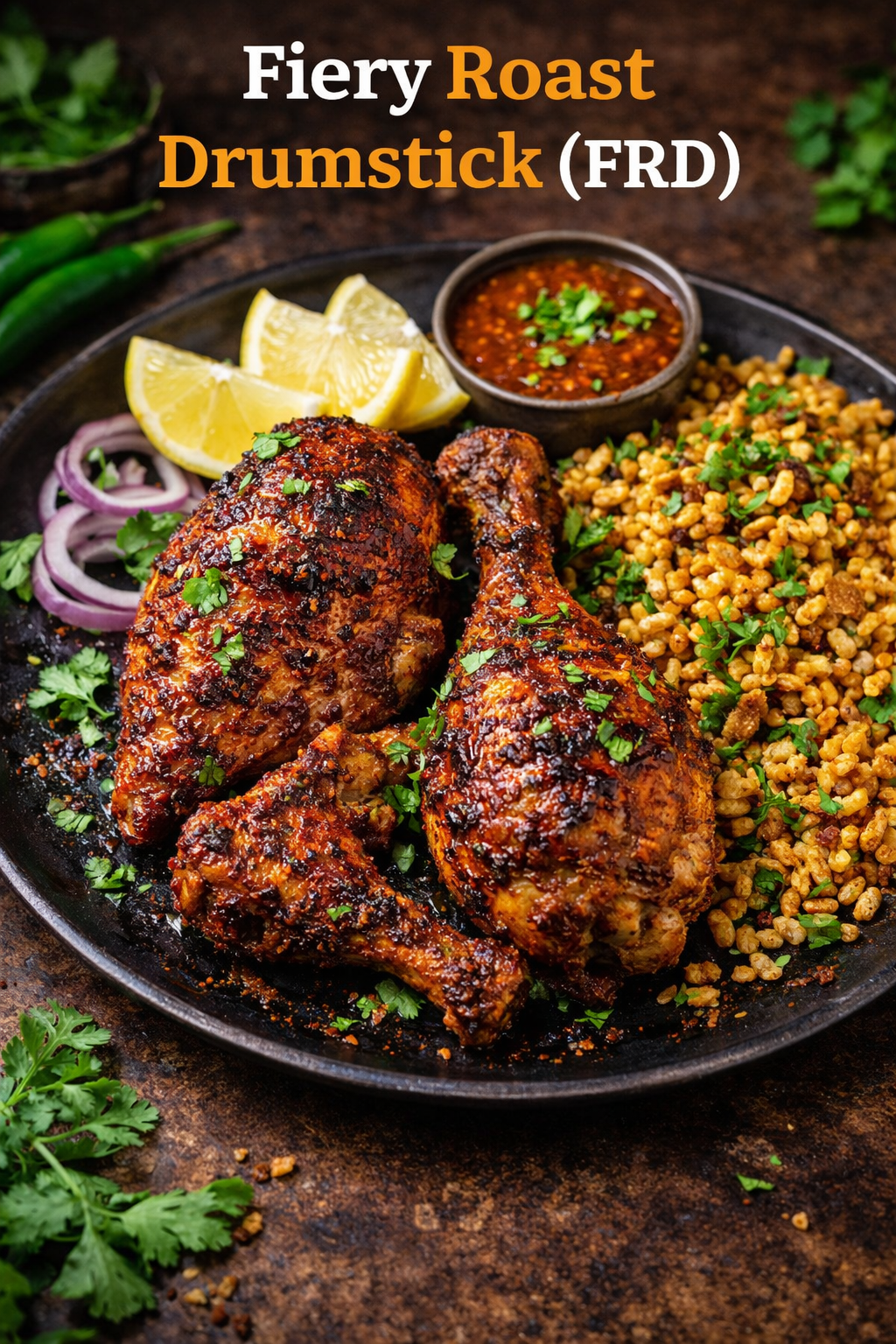 Ignite your appetite with Fiery Roasted Drumstick, a bold chicken favourite packed with smoky heat and deep spice. Juicy drumsticks are marinated in a vibrant blend of crushed red chillies, garlic, ginger, and aromatic herbs, then slow-roasted until the skin turns beautifully charred and crisp. The high-heat roasting seals in tenderness while building a rich, peppery crust that delivers a lingering warmth in every bite. Finished with fresh coriander and a squeeze of lemon, this spicy sensation brings rustic fire and flavour straight to your plate.