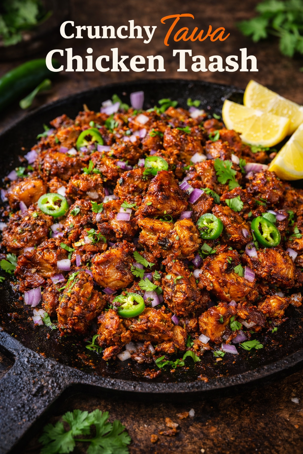 Turn up the heat with Crunchy Tawa Chicken Taash, a street-style favourite bursting with bold Champaran & Nepali flavours. Tender chicken pieces are marinated in crushed spices, garlic, ginger, and fresh herbs, then tossed on a sizzling hot tawa until the edges turn irresistibly crisp. The high-heat roasting locks in juicy goodness while creating a smoky, spicy crust that crackles with every bite. Finished with chopped onions, green chillies, and a squeeze of lemon, this vibrant dish brings the lively taste of traditional gatherings straight to your table.